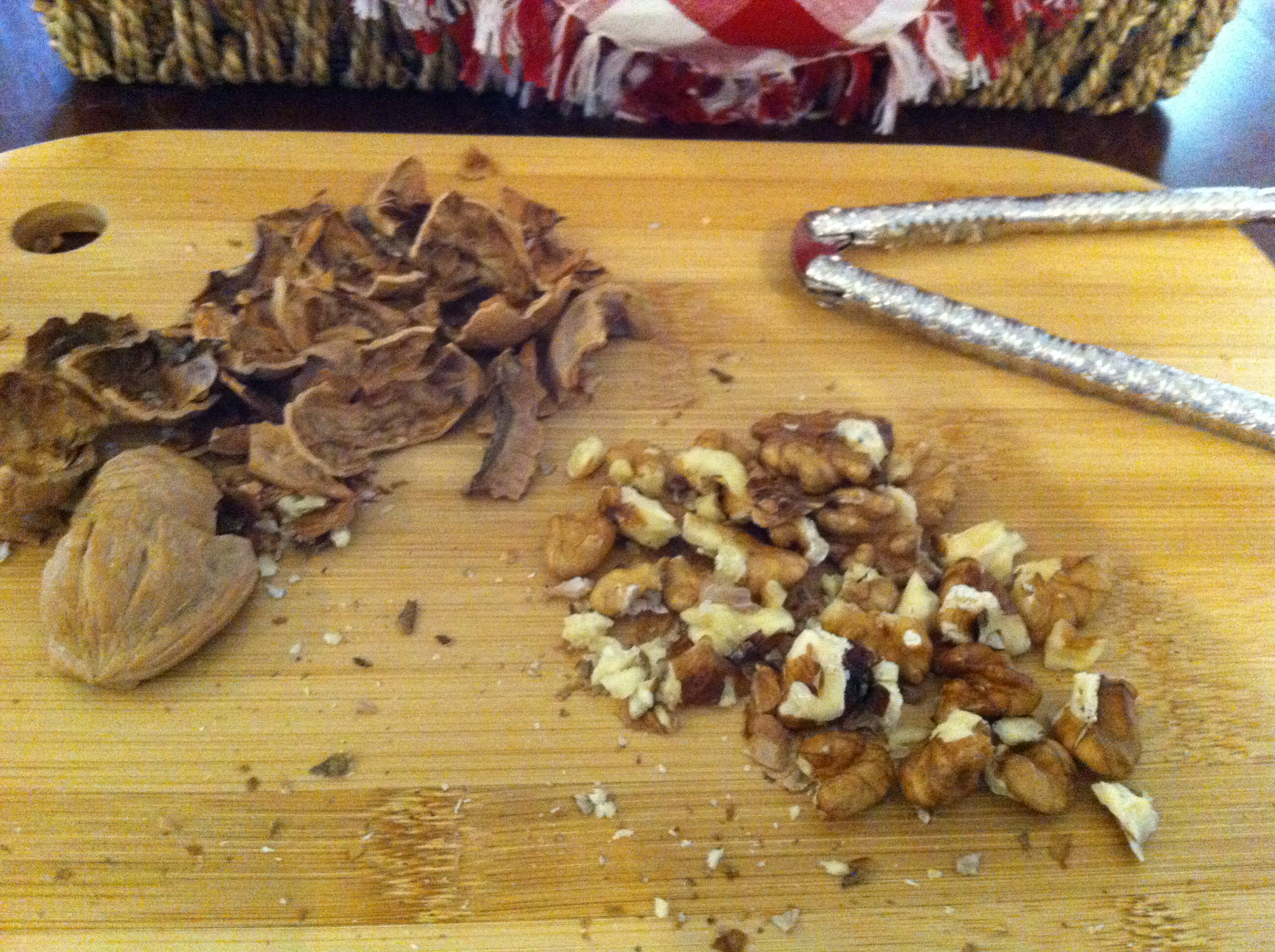 The comparison of nut to shell. This is the result of shelling four black walnuts. The nut is sweet, and very…nutty. Quite good, actually, but I think next year…I’ll probably just leave all of them for the squirrels. Obviously, they are more equipped to eat these nuts than I am!!