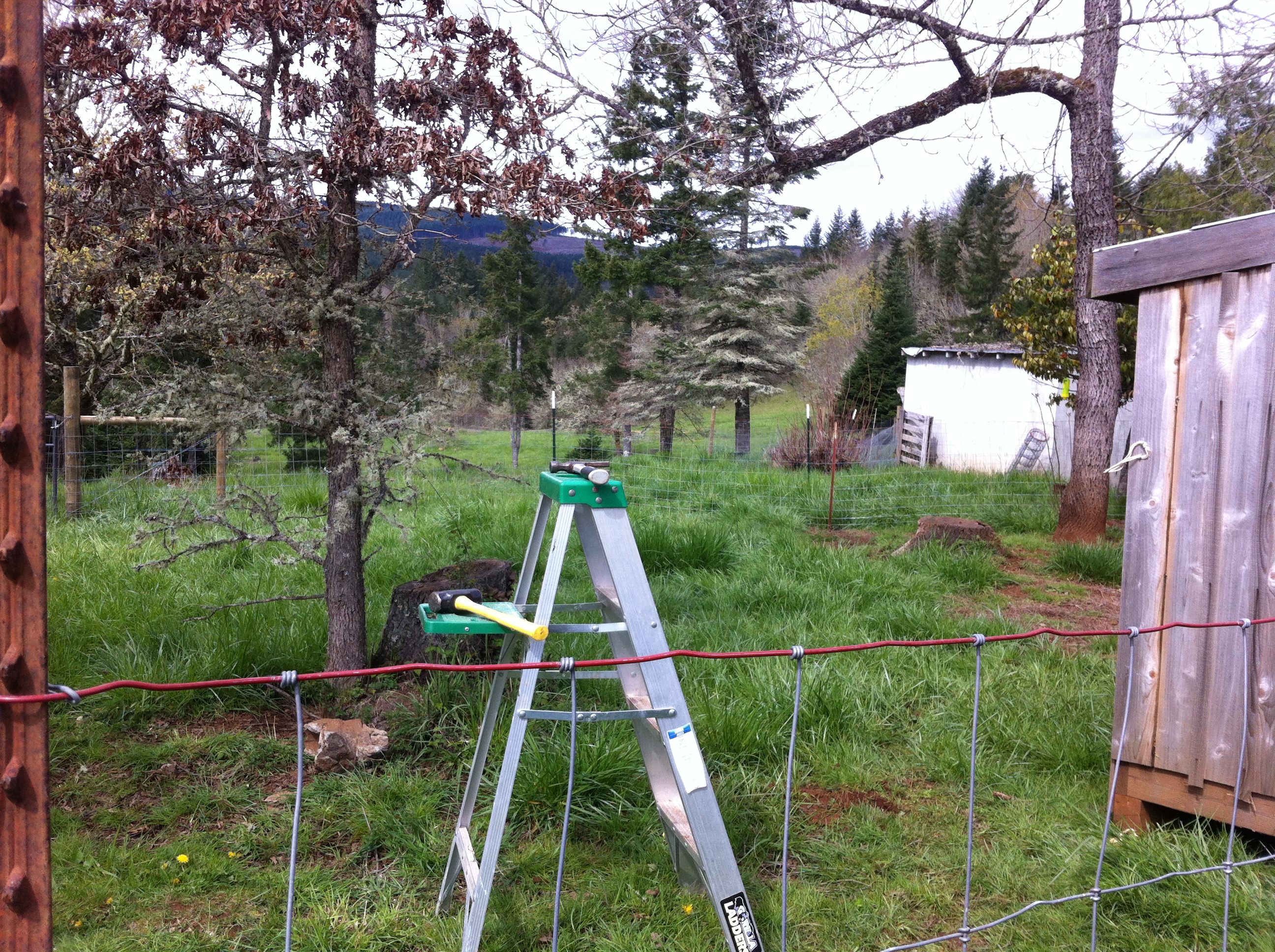 The fencing went up pretty quickly as the ground was soft from all of the rain. It was so great to find that the roll of fencing we had left over in the barn was enough to encompass the entire area which is about 1500 – 1600 square feet. These little guys are used to foraging over 250 acres with the herd, or staying in if they prefer….hopefully this area that seems large enough for a few weeks will keep them safe and entertained enough that they don’t push their fence boundaries.