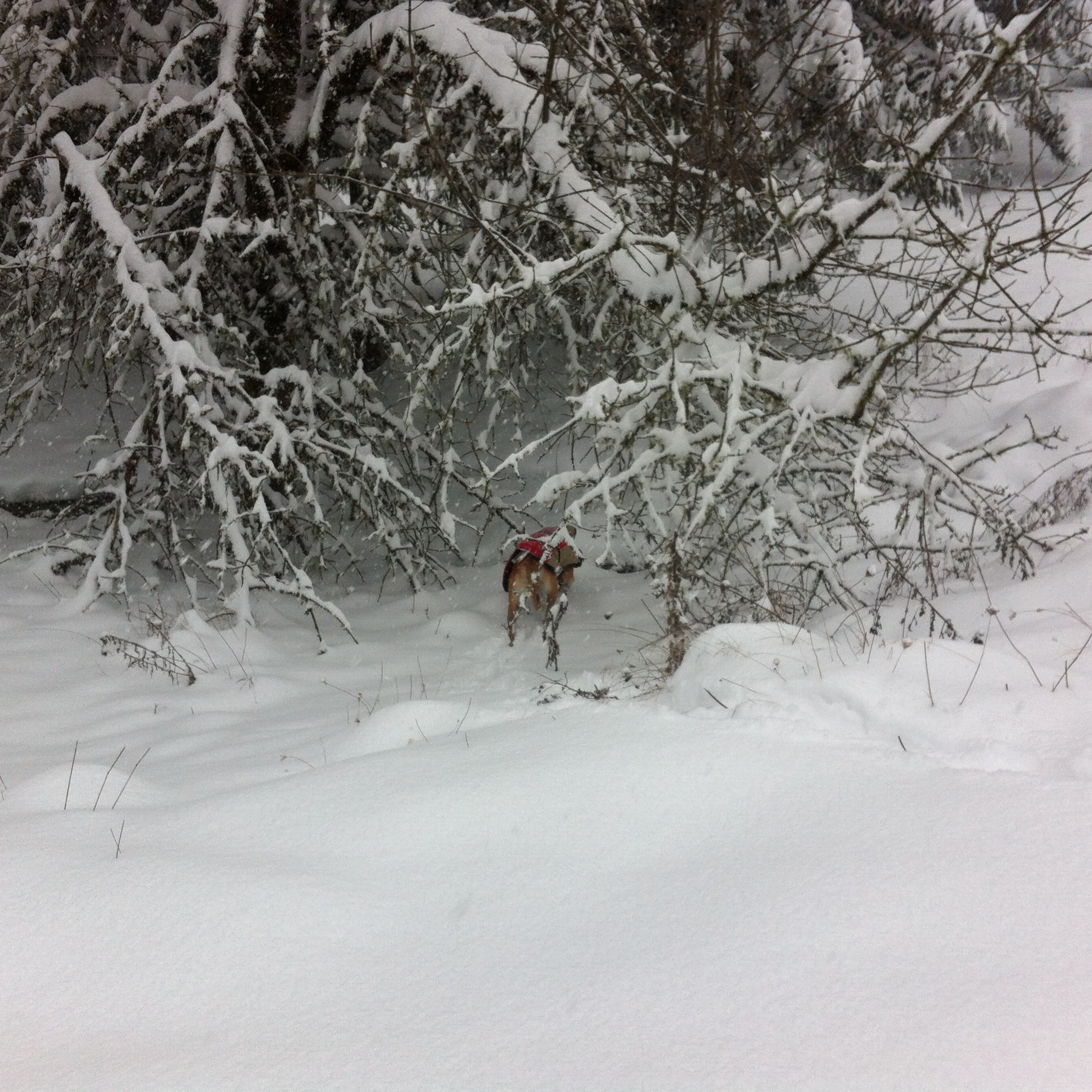 Sometime in the very early hours of Monday morning, snow started to fall again. These were big, chunky, fat flakes….they were the type that would land on the dog….and stay on the dog…haha!